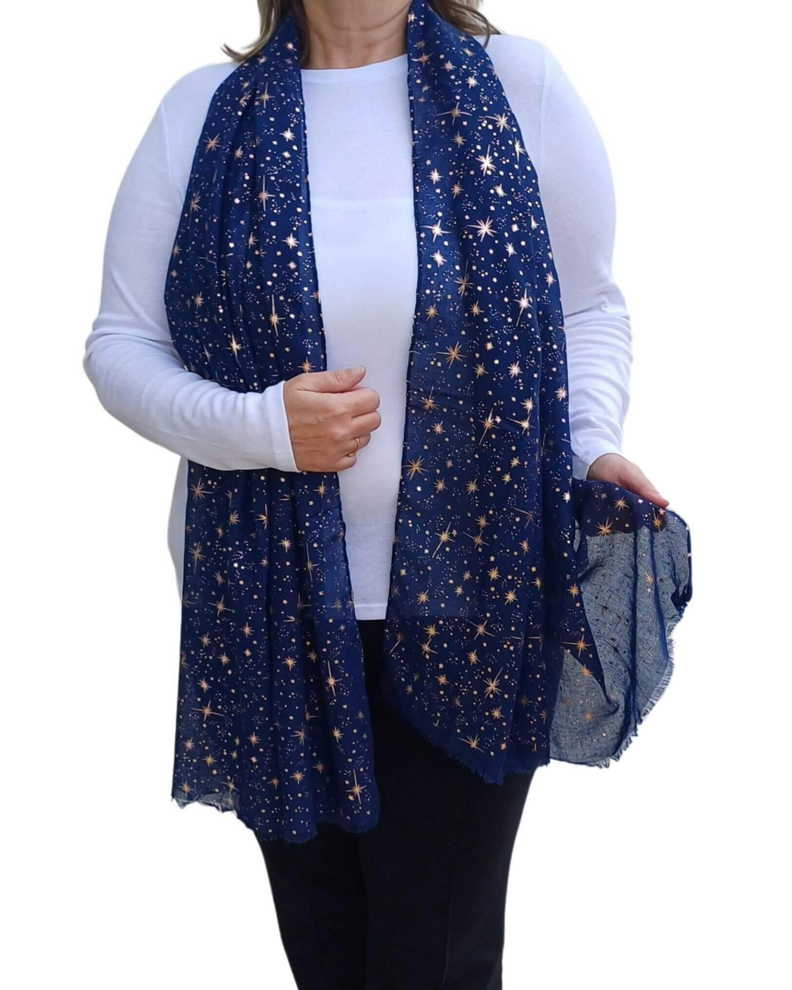 Wrap yourself in the luxury of this lightweight, soft large scarf! Its unique rose gold galaxy star foiled print will have you shinning like a star! Great for all sorts of occasions, from casual to elegant events, and even for birthdays, Mother's Day, Father's day, Valentine's Day, and Christmas. One side printed on Cotton viscose mix. A perfect gift for anyone who loves to sparkle and shine!